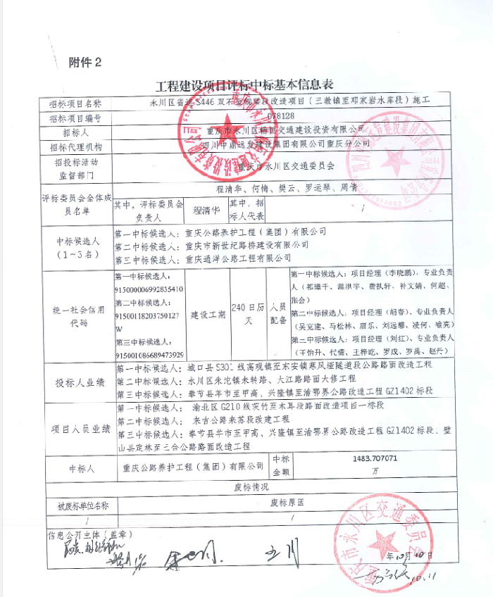 永川区省道S446双石至铜梁段改造项目(三教镇至邓家岩水库段)施工工程建设项目评标中标基本信息表