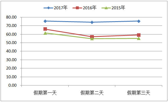 路网每日车流趋势预测。近三年元旦假期车流量最高值均出现在假期第一天,三年均呈现两头高中间低的趋势。预计2018年元旦假期高速公路车流也将呈现相对平缓的 “V”字型走势:假期第一天车流量最高,第二天略有下降,假期最后一天小幅回升。  近三年车流量走势(单位:万辆次) 大流量路段预测和建议绕行线路 2018年元旦假期,市民出行主要以短途旅游与回家探亲为主,车流量较大的路段将主要集中在绕城高速以内各条射线路段。收费站、隧道、养护施工等瓶颈路段容易成为堵点,建议广大市民提前合理安排出行线路。 预计路网出城车流高峰时段将出现在:12月29日 下午16:00-20:00,12月30日 上午8:00-12:00;返城高峰时段将出现在:1月1日 下午15:00-22:00。 根据以往高速公路通行情况,2018年元旦假期易堵路段预测如下: