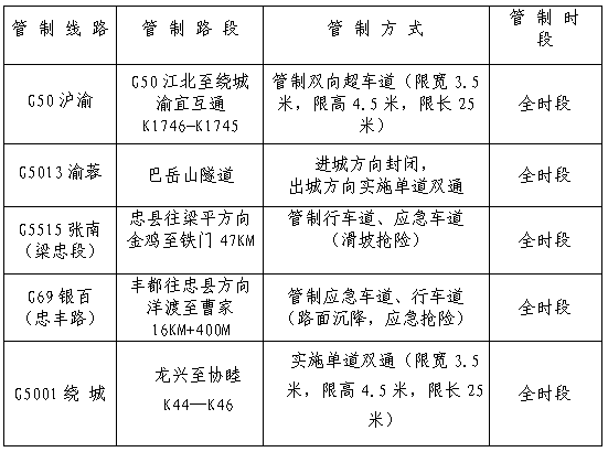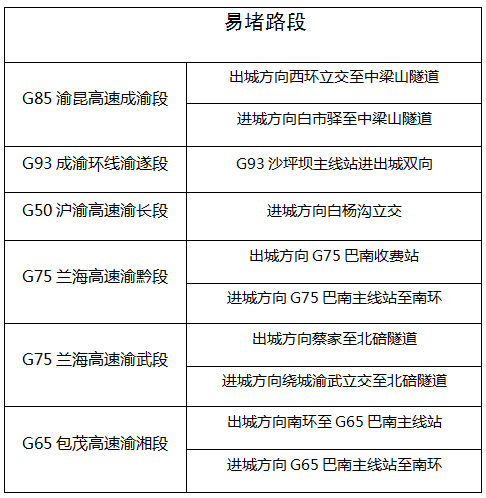 元旦假期高速公路管制路段 绕行建议: 1.G85渝昆高速,拥堵点:中梁山隧道 建议绕行线路:内环石马河立交-双碑大桥-双碑隧道-G5013沙坪坝主线收费站-G5001绕城高速-G85渝昆高速成渝段。 2.G75兰海高速,拥堵点:北碚隧道 建议绕行线路:三溪口互通-G212-G5001绕城高速施家梁收费站- G5001绕城高速-G75兰海高速渝武段。 新通车高速公路出行提醒 九永高速(重庆九龙坡至永川)于12月26日开通,九永高速为成渝高速的扩能高速公路。九永高速沙堡主线收费站尚未开通,市民可通过绕城高速至绕城沙堡互通上道九永高速,绕城沙堡互通位于绕城成渝互通与绕城双福互通之间,九永高速于小坎互通与G85渝昆高速成渝段相接,于双凤互通与S0101三环高速永川至江津段相接。