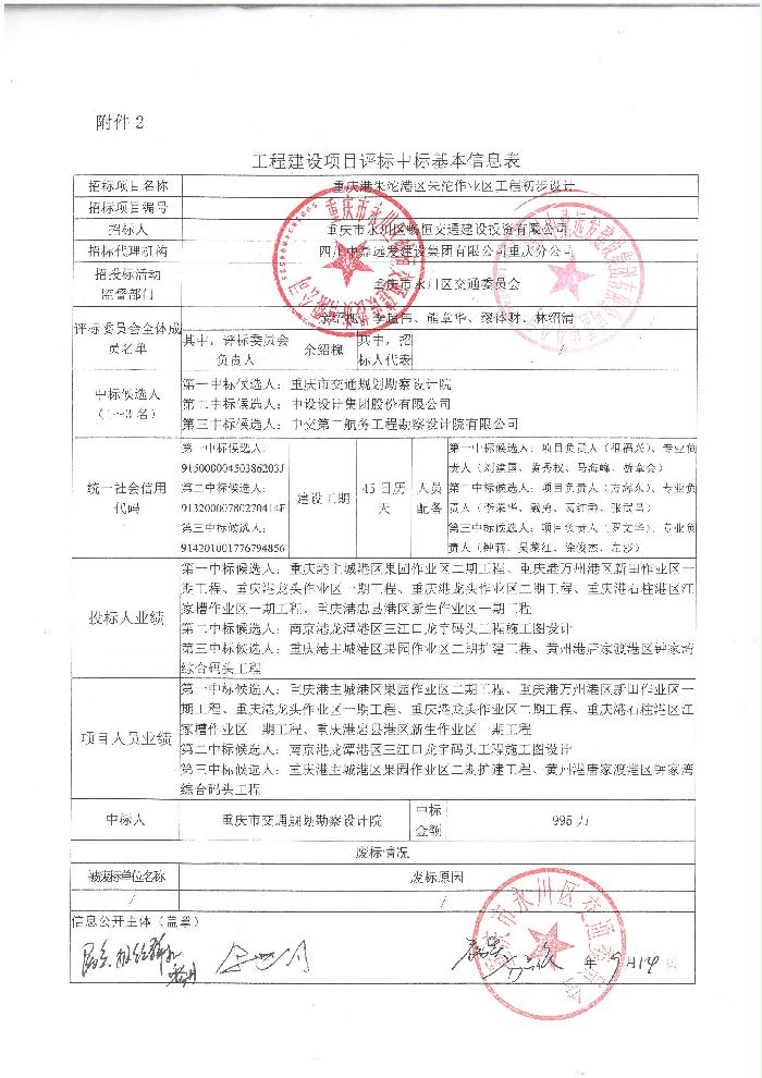 重庆港朱沱港区朱沱作业区工程初步设计工程建设项目评标中标基本信息表