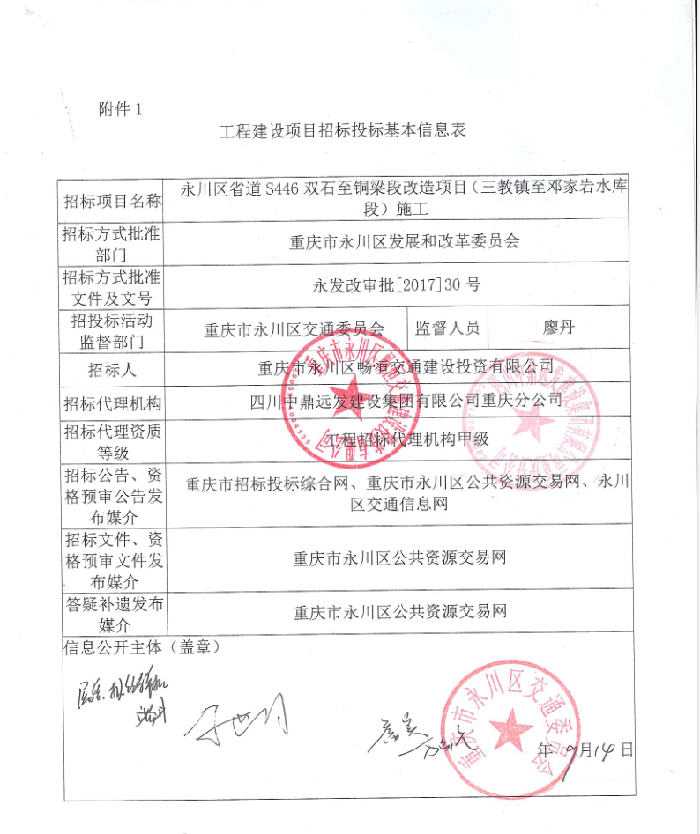 永川区省道S446双石至铜梁段改造项目(三教镇至邓家岩水库段)施工工程建设项目招标投标基本信息表